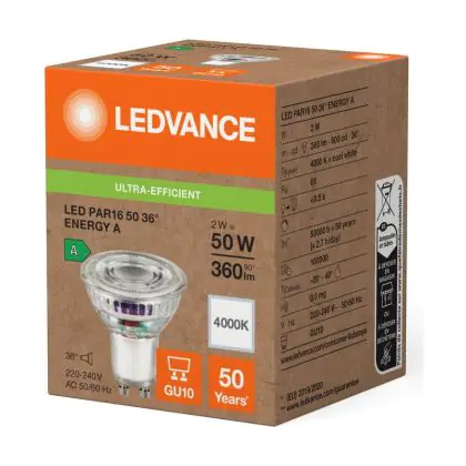 Beschrijving Ledvance LED PAR16 GU10 Reflector 2W 360lm 36D - 840 Koel Wit | Vervangt 50W