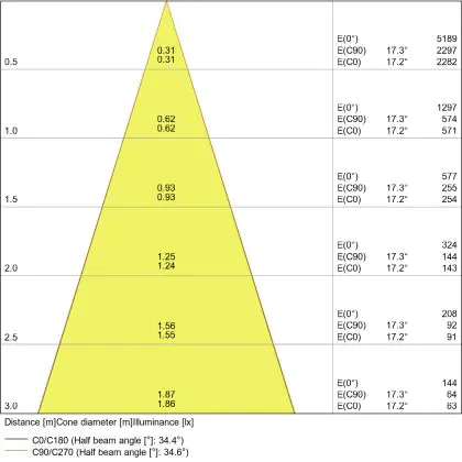 De lichtopbrengst en de gradenbundel spelen een grote rol. Zo geeft de lichtopbrengst van 620 Lumen in combinatie met de 36° stralingshoek deze inbouwspot een specifieke toepassing. Kort samengevat is een lichtintensiteit van maximaal 400 Lumen ideaal voor accentverlichting, terwijl hogere waardes goed gebruikt kunnen worden als basisverlichting. Over het algemeen geldt: hoe breder de gradenbundel, hoe geschikter deze is door basisverlichting. Dit komt doordat het licht over een groter oppervlak wordt verspreid. Smallere gradenbundels (tot 40°) kunnen echter bij hoge plafonds ook goed tot hun recht komen als algemene verlichting.