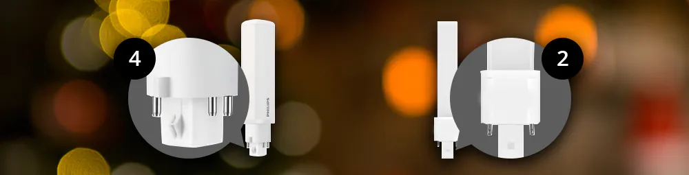 Bij (LED) spaarlampen bestaan er fittingen/lampvoeten met 2 pinnen of 4 pinnen. Kies altijd een spaarlamp met dezelfde lampvoet, anders past deze niet in het armatuur en werkt deze niet. Spaarlampen met een 2-pins fitting werken met een conventioneel voorschakelapparaat (EM) incl. starter. Spaarlampen met een 4-pins fitting werken met een elektronisch voorschakelapparaat (HF) zonder starter.