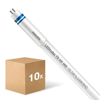 De Voordeelpak 10x Philips LED Buis T5 MASTER Instantfit (HF) High Output 10.5W 1600lm - 840 Koel Wit | 55cm - Dimbaar - Vervangt 24W is het perfecte alternatief voor conventionele TL lampen. Met een verbruik van 10.5W, bespaar je veel energie vergeleken met conventionele TL lampen die 24W verbruiken. Dit verschil ga je dan ook zeker merken in je maandelijkse energie- en onderhoudskosten!